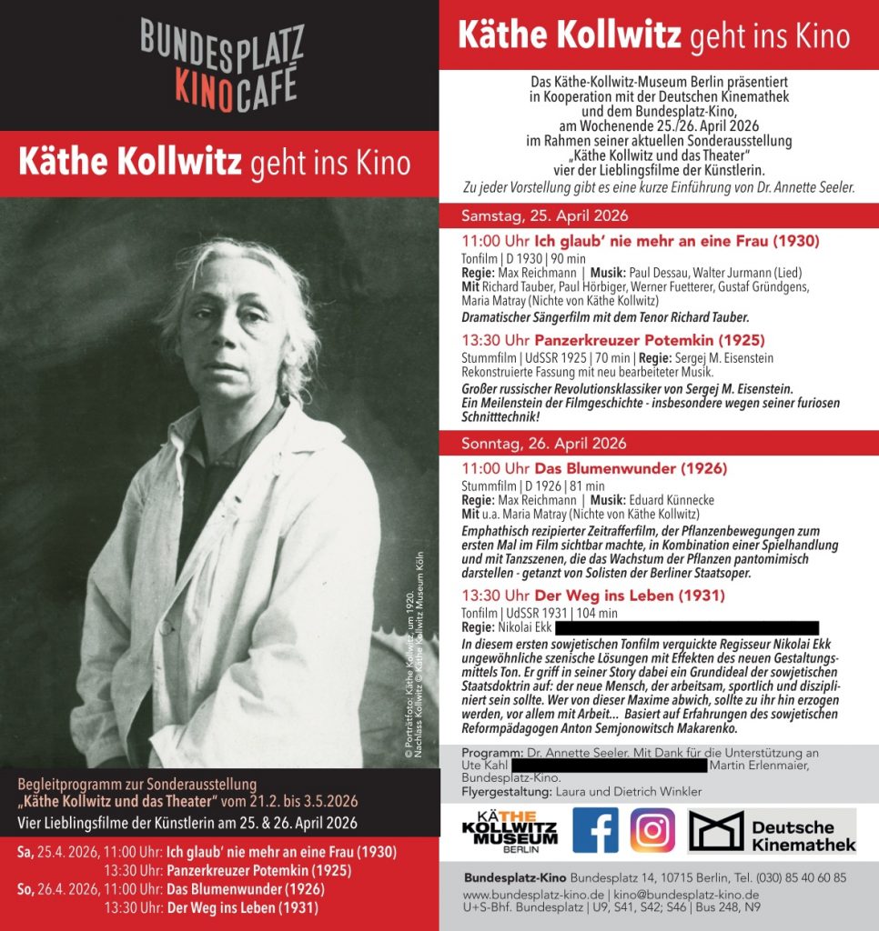 Im Rahmen der aktuellen Sonderausstellung lädt das Käthe-Kollwitz-Museum Berlin gemeinsam mit der Deutschen Kinemathek und dem Bundesplatz-Kino zu einem besonderen cineastischen Wochenende ein: Unter dem Titel „Käthe Kollwitz geht ins Kino“ werden am 25. und 26. April 2026 im Bundesplatz-Kino vier Filme gezeigt, die die Käthe Kollwitz nachweislich kannte und schätzte.
