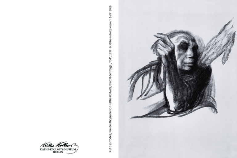Vierseitige Klappkarte mit dem Motiv der Lithografie “Ruf des Todes” von Käthe Kollwitz, inklusive Briefumschlag.
