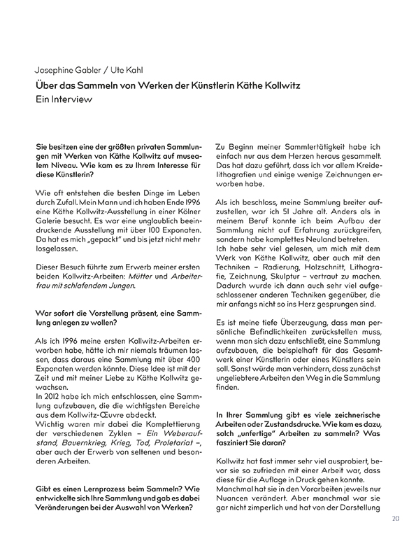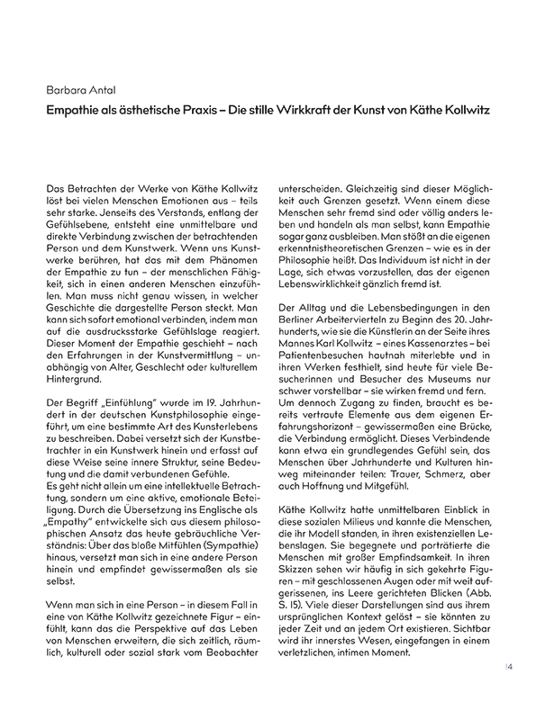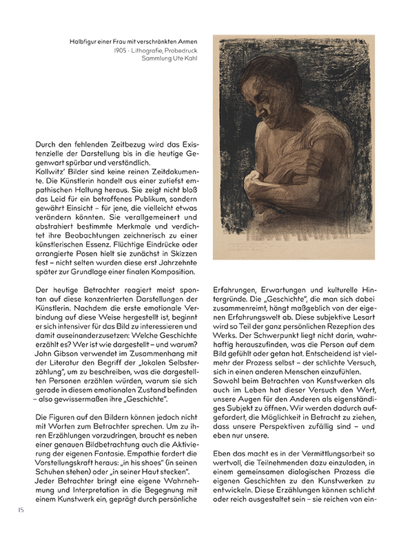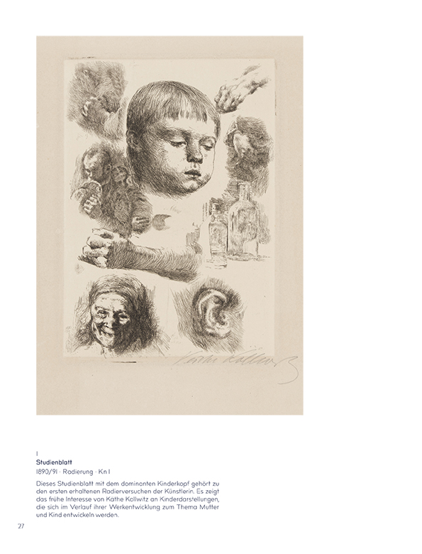 Käthe Kollwitz hat neben ihren bekannten sozial engagierten Arbeiten immer auch Werke geschaffen, in denen sie sich grundsätzlich mit menschlichen Gefühlslagen auseinandersetzt. Sie hat es dabei verstanden, starke Empfindungen aus ihrem zeitlichen Kontext zu lösen und auf einen allgemein gültigen Gehalt zu konzentrieren. Es sind Gefühle wie Sorge, Trauer, Apathie, Verzweiflung oder ein sich in eine Situation Ergeben, die in diesen besonderen Blättern intensiven Ausdruck finden.
