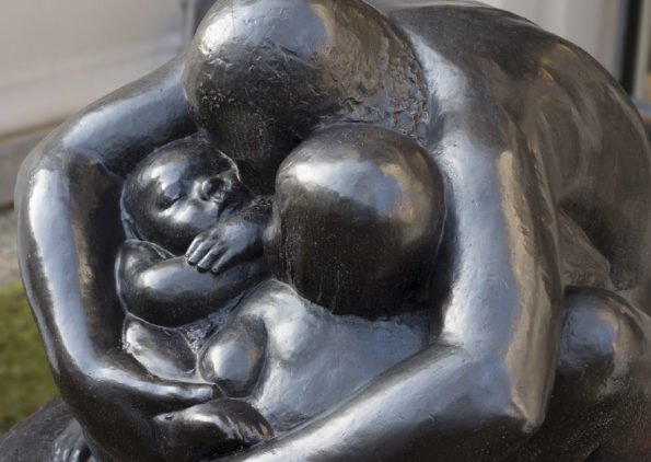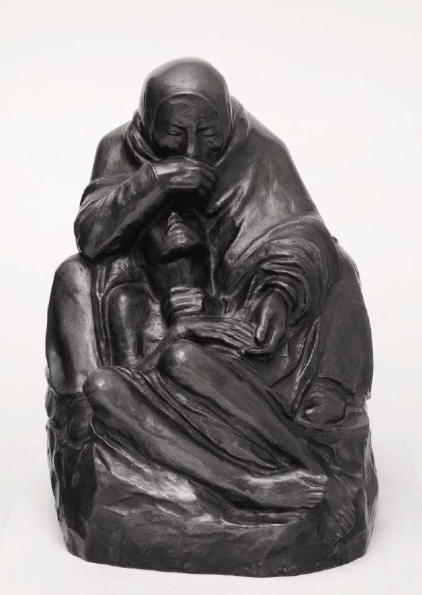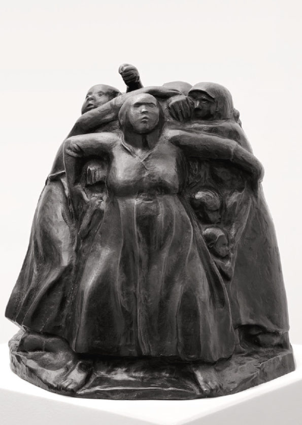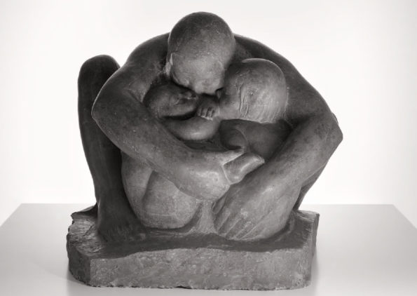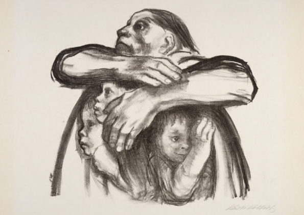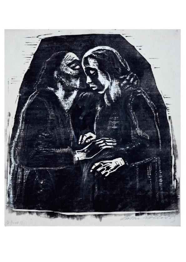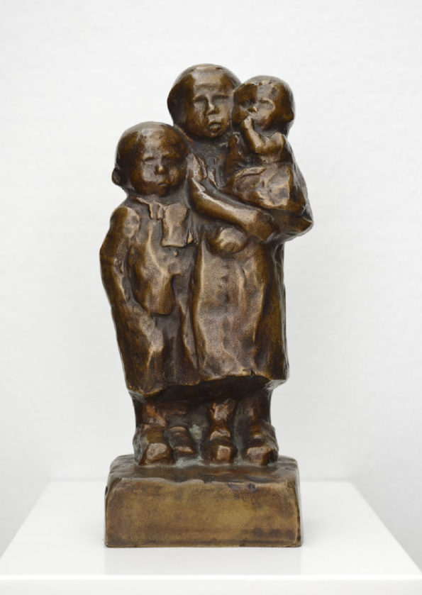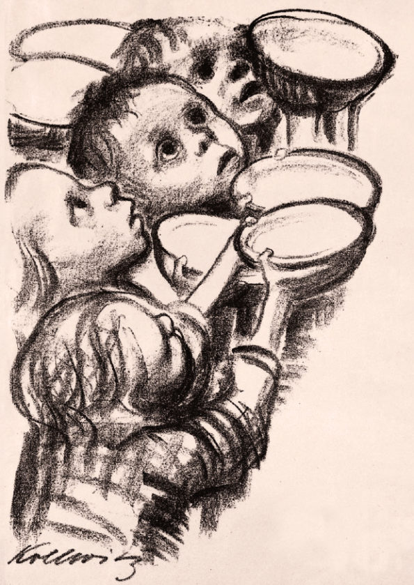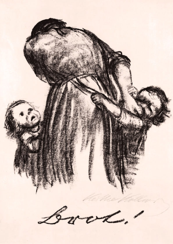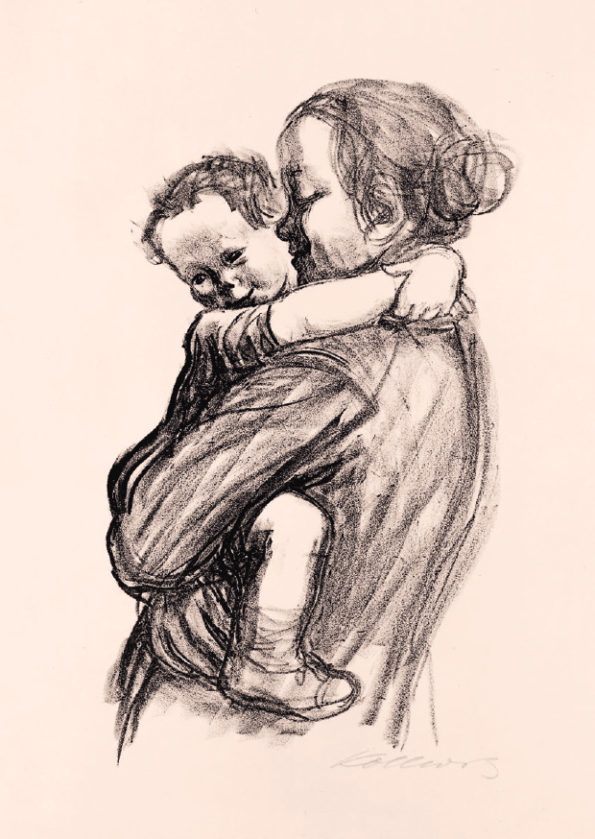 Käthe Kollwitz war Zeit ihres Lebens eine aufmerksame Beobachterin, die auch Alltagsszenen interessiert wahrnahm, in ihrem Tagebuch beschrieb und zeichnerisch festhielt. Diese Skizzen dienten ihr als Übung und als Ideenvorrat zur späteren künstlerischen Verwendung, das zeigt sich auch in ihren verschiedenen Darstellungen zum Thema Mutter und Kind. In den 1920er Jahren sind die Folgen des Ersten Weltkrieges in der Kunst von Käthe Kollwitz vorherrschend. Während der Kriegsjahre rang sie um die perfekte künstlerische Technik, um die sieben Blätter zum Kriegszyklus ihren Vorstellungen entsprechend auszugestalten. Zum sechsten Blatt der Kriegsfolge “Die Mütter” gibt es eine verworfene Lithografie von 1919 und den finalen Holzschnitt von 1921/22, in dem die viel spätere Plastik “Turm der Mütter” bereits figürlich angelegt ist. Um auf die soziale Not und den Hunger der Kinder in den Arbeiterfamilien hinzuweisen, schuf Kollwitz Motive für Plakate und günstige Kunsteditionen, deren Erlös der Arbeiterhilfe zugute kam.