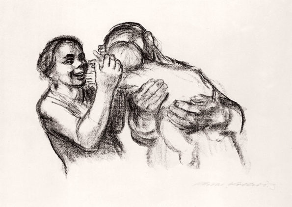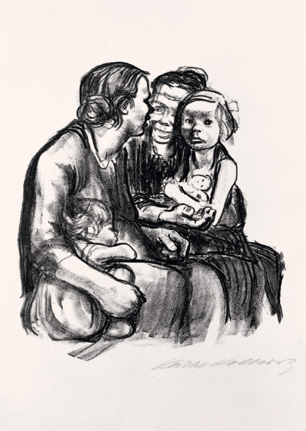 In den 1930er Jahren werden die grafischen Mutter-und-Kind-Szenen inniger, entfernen sich von den bedrückenden Themen wie Hunger und Kriegssorge. Käthe Kollwitz war in dieser Zeit bereits mehrfache Großmutter und beobachtete die herzliche Mütterlichkeit in der eigenen Familie. Die Hinwendung zur Familie ist allerdings auch der politischen Situation in Deutschland geschuldet. Nach Machtergreifung der Nationalsozialisten werden politische Themen gefährlich, inbesondere wenn sie das aktuelle System kritisieren. Ganz verschließen konnte und wollte sich Käthe Kollwitz der Situation allerdings nicht. In ihrer letzten Lithografie von 1941 griff sie das Goethe-Zitat aus ihrer Dehmel-Entgegnung von 1918 wieder auf, will es als ihr Vermächtnis verstanden wissen: “Saatfrüchte sollen nicht vermahlen werden”.