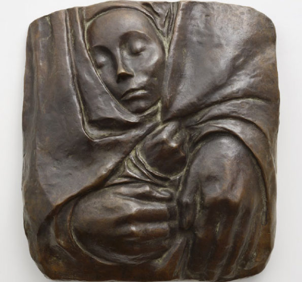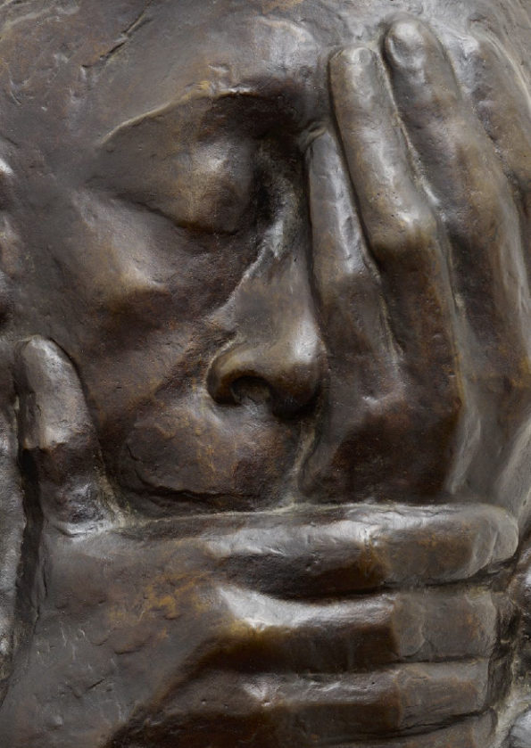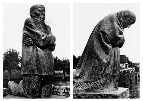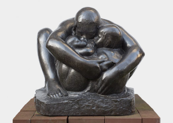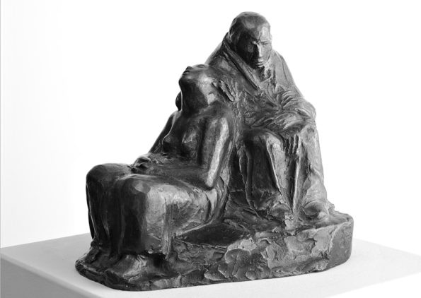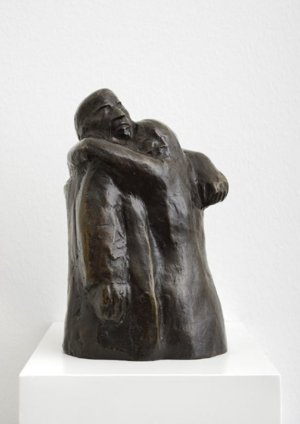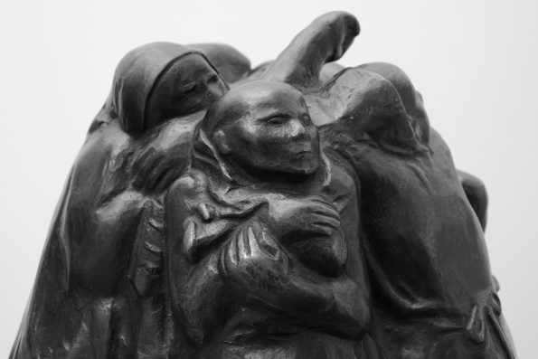 “Das Liebespaar” ist ihre erste Plastik, entstanden fast 10 Jahre nach Paris und eine Reminiszenz an die Figurengruppe “Der Kuss” von Auguste Rodin, den sie während ihres Pariser Studienaufenthalts im Atelier besuchen konnte. Im plastischen Arbeiten war Kollwitz anfangs unsicher, sie holte sich oft Rat bei Künstlerkollegen wie August Gaul. Ihr plastisches Oeuvre ist überschaubar und dennoch eindrucksvoll. Allen voran die weltbekannte Gruppe “Mutter mit totem Sohn”, auch bekannt als “Pietà”, die seit 1993 in vierfacher Vergrößerung in der Neuen Wache in Berlin, der Zentralen Gedenkstätte der Bundesrepublik Deutschland, an die Opfer von Krieg und Gewaltherrschaft erinnert. In Belgien, Russland und in Köln stehen die “Trauernden Eltern” von Käthe Kollwitz, zur Erinnerung an die Gefallenen in den beiden Weltkriegen. Krieg, Trauer und Abschied sind die vorherrschenden Themen in diesen Werken, doch es findet sich auch tröstliches wie die kleine Kindergruppe oder die große Gruppe “Mutter mit zwei Kindern”, die in Berlin sowohl als Steinfigur als auch in unserem Museum in Gips und Bronze anzuschauen ist.